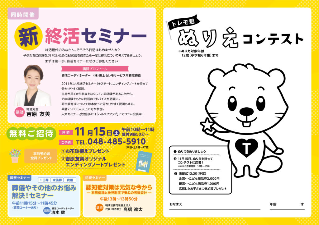 また最近大人気の「学び」もあります。「終活セミナー」、「葬儀やその他のお悩み解決!セミナー」、加えて「認知症対策は元気な今から」のセミナー3本同時開催!事前予約した方にはもれなく「お花🪷鉢植え」&「エンディングノート📓」のダブルプレゼントもご用意していますので、事前のご予約がお得です!🙋♀️ → 048-485-5910